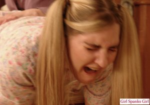 Two schoolgirls, played by Sarah and a young Sinn Sage (one of her first spanking videos ever), are spanked at school, by the very strict Chelsea Pfeiffer, who takes Sarah, then her sister Sinn over her knee of some hard hand spankings, then spankings with implements and then she sends them home with a note, where there mother spanks them, too.